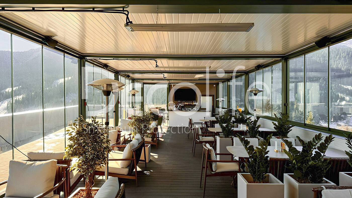 Decolife pergolas B500-25P, B600 PIR + sliding glazing S200