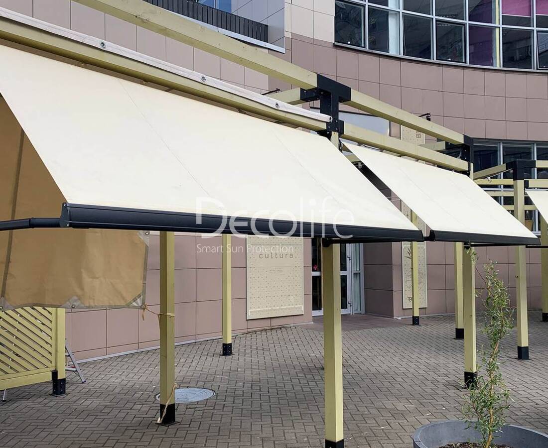 When turned, the shuttlecock turns into a kind of panel and makes it possible to minimize the ingress of sunlight from the side. The stretched canvas is closed from the negative effects of the environment with the help of a special cover. The material is tightly fixed on the support and twisted automatically or manually.