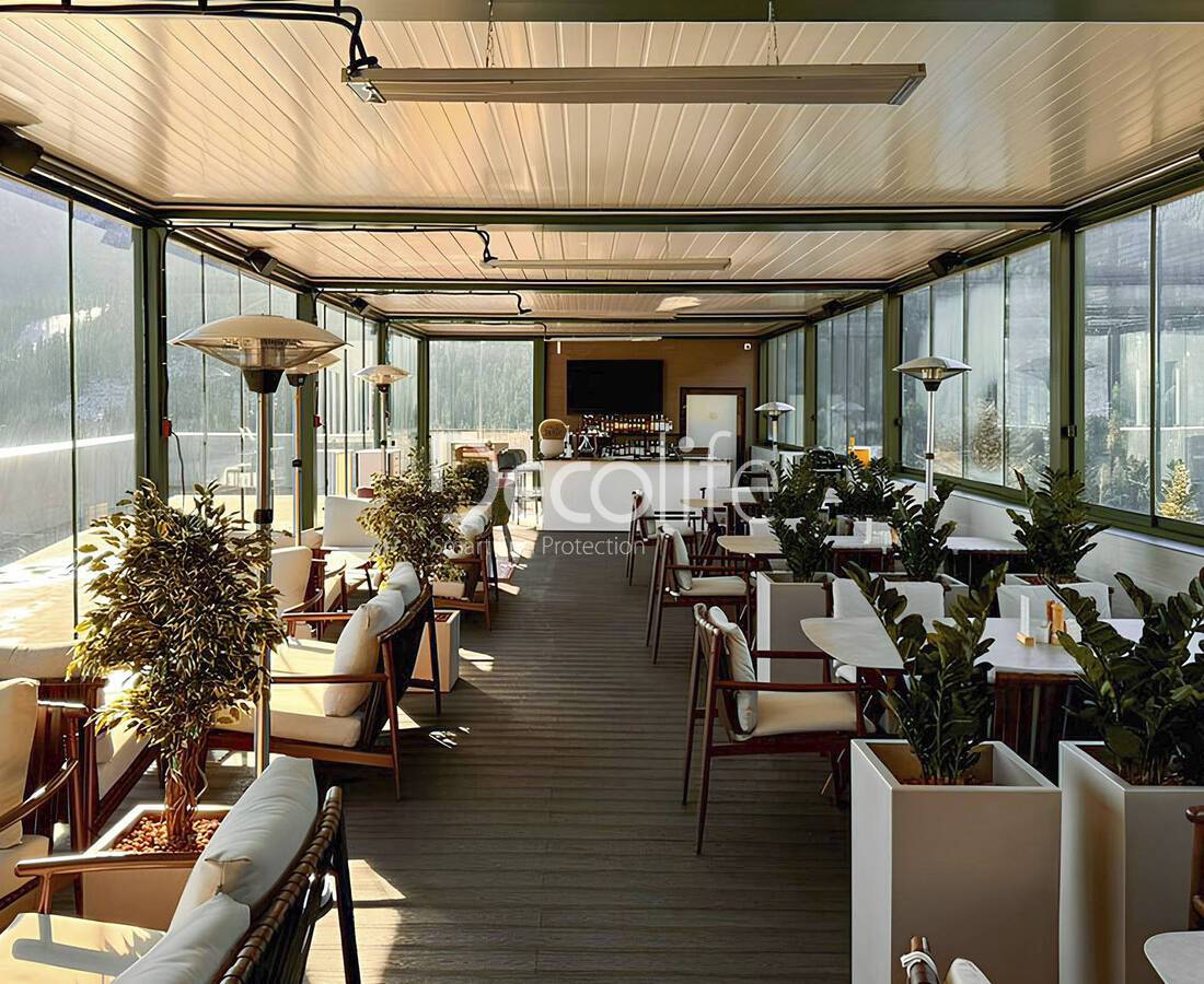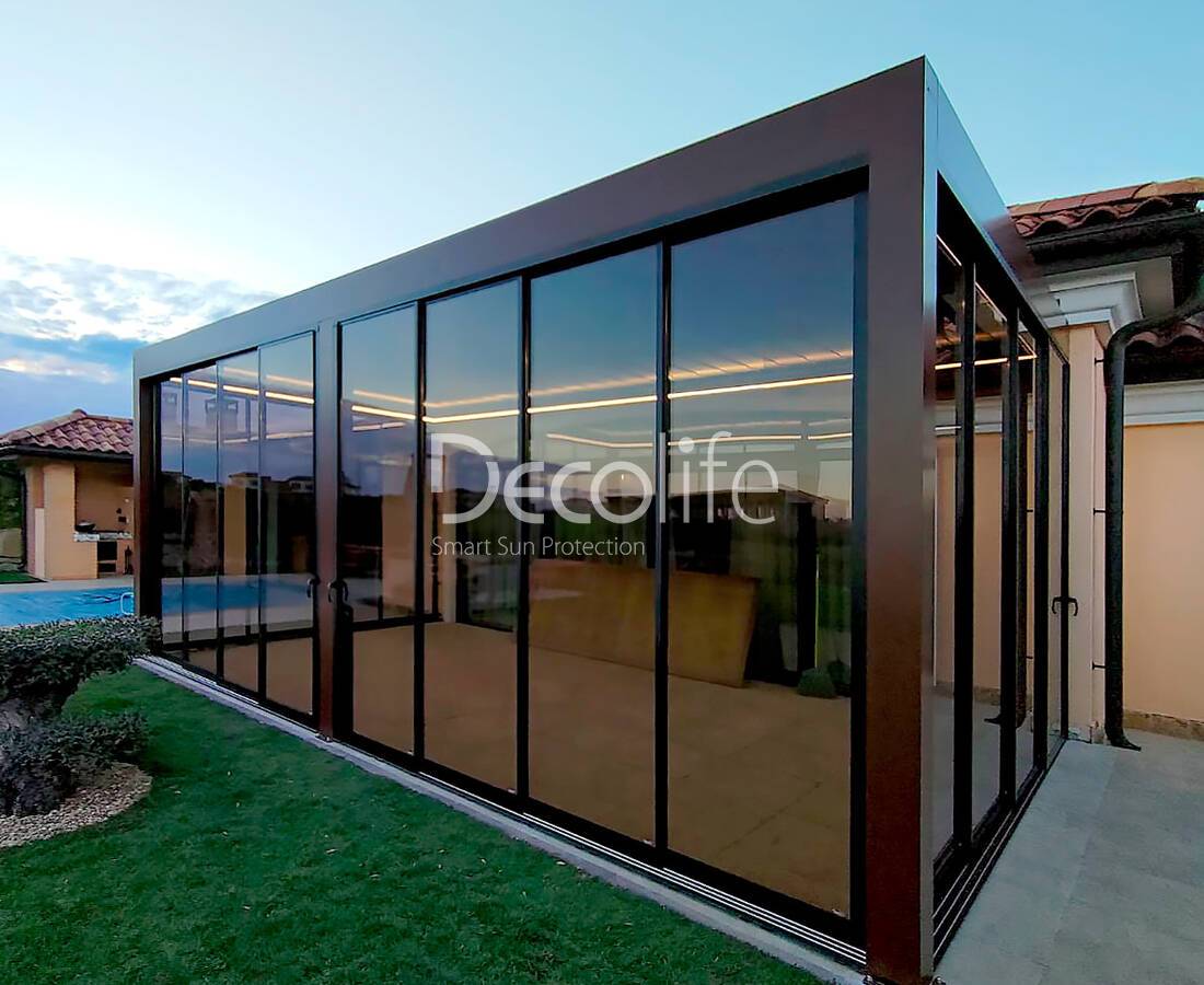 The recommended panel height is 3,25 meters, the maximum number of glass panels is 10 pcs. Compatible with the entire Decolife range of pergolas.